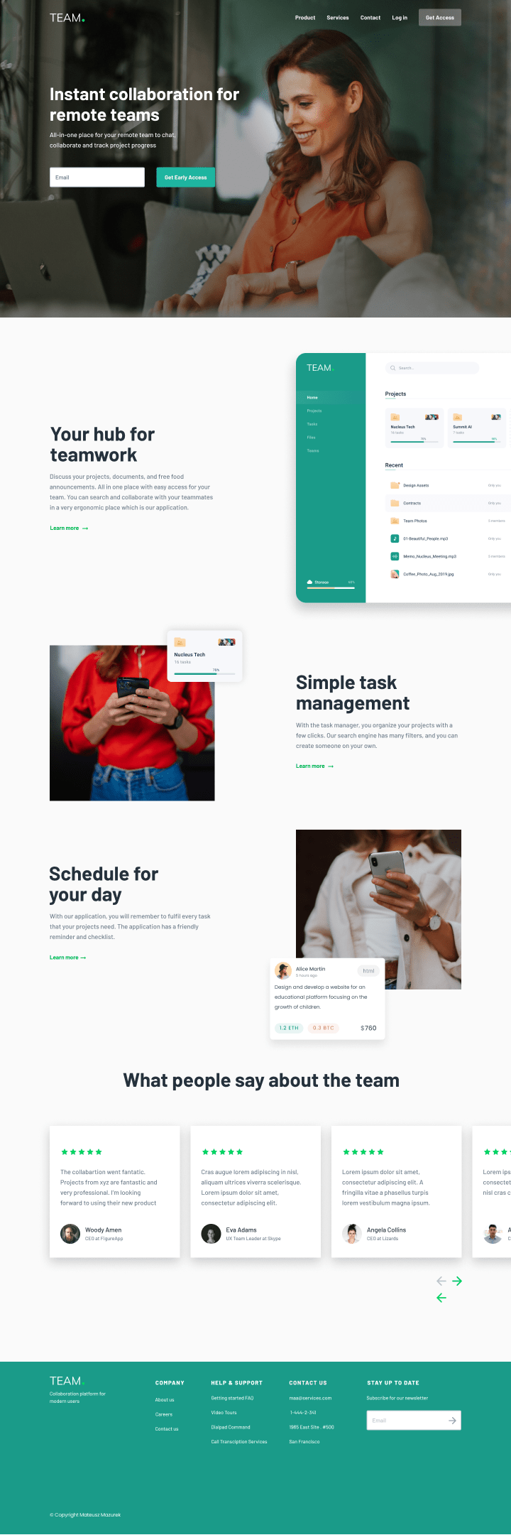 Następnie rozpocząłem pracę nad designem strony. Wyszukałem odpowiednie zdjęcia i zasoby na strony, które umieściłem, tak jak we wcześniej zaplanowanej makiecie. Do tego zadania wykorzystałem zasoby ze stron takich jak sketchappsources i sketchrepo, których autorzy udostępniają za darmo gotowe elementy przygotowane w Sketchu. Dzięki temu przedstawiłem na stronie dashboard oraz funkcje aplikacji. Fragmenty nakładające się na zdjęcia w sekcji środkowej zostaną animowane. Oczywiście wybrane elementy zostały dopasowane kolorystycznie i tematycznie.